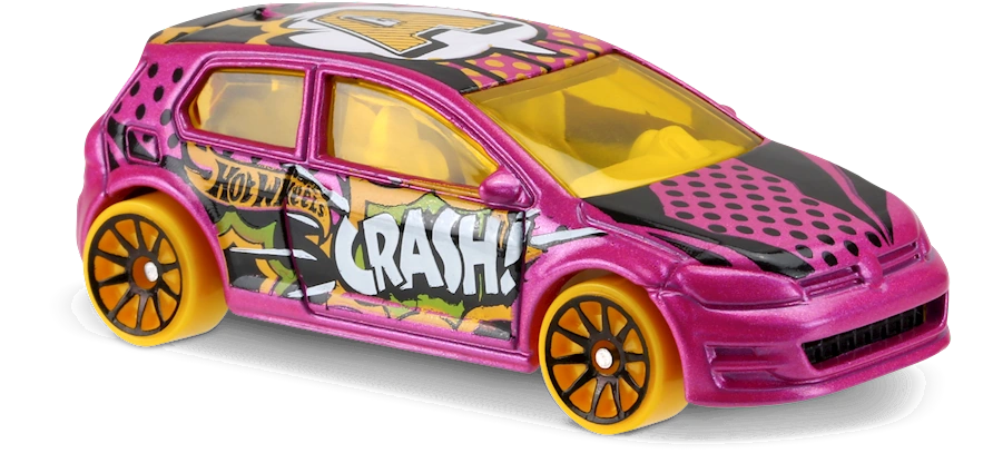 Pink | 'CRASH!' on left side, 'ZOOM' on right side, stripes on sides, Black stripes on hood, 'A' in cloud on roof | Black / Plastic |