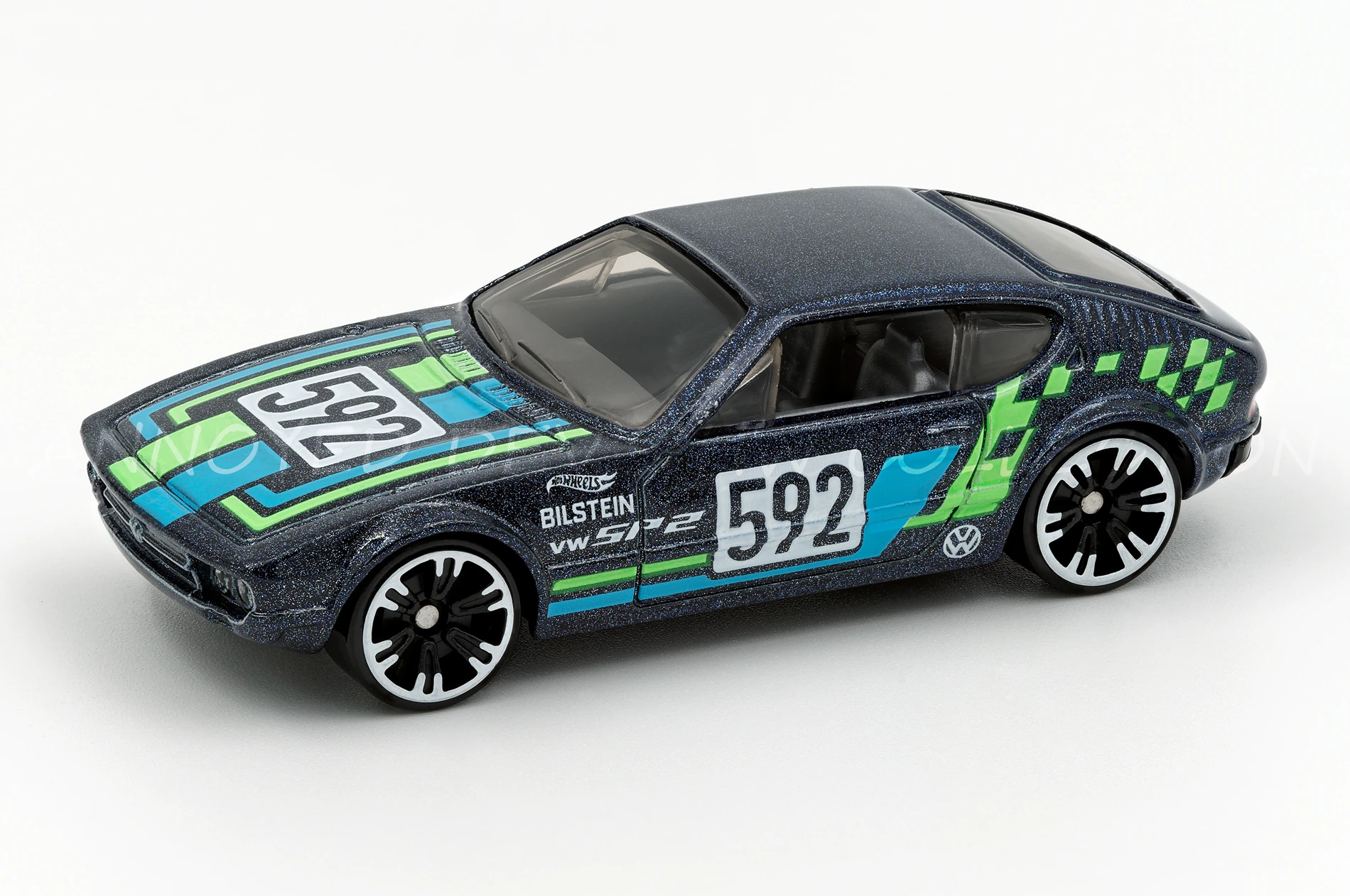 Metalflake navy blue | Neon green and blue stripes and '592' number plate on sides and hood; HW, VW, and Bilstein logos on sides | Black / Plastic |